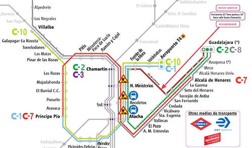 - Corredor del Henares C2, C7 y C8: los trenes circulan únicamente entre las estaciones de Atocha y Alcalá de Henares con una frecuencia de 10 minutos y entre Atocha y Guadalajara con una frecuencia de 20 minutos. Nuevo Servicio Especial por vía de contorno entre Guadalajara y Chamartín con frecuencia de 15 minutos en horas punta y semi punta, y resto con frecuencia de 30 minutos. Este servicio tiene como principales paradas: Guadalajara, Alcalá de Henares, Torrejón de Ardoz, Fuente de la Móra y Chamartín (recomendado).