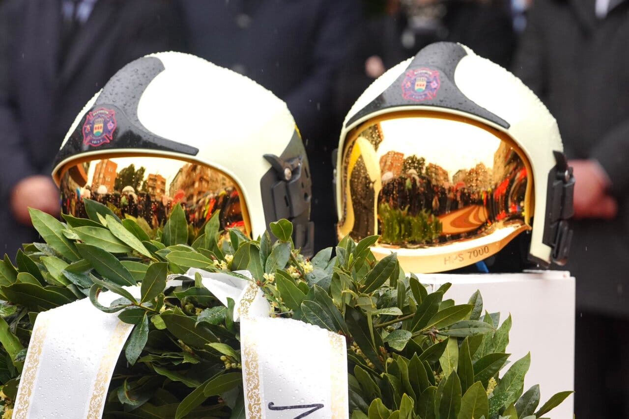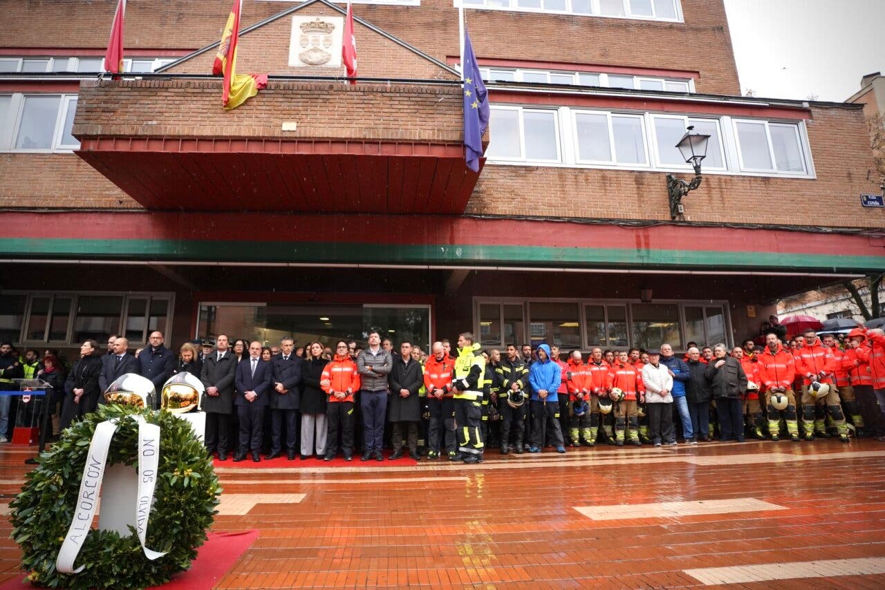 «Gracias por acompañar a la ciudad de Alcorcón en este día tan gris; hoy estamos de luto y lo estaremos durante los tres días que hemos decretado en memoria de dos servidores públicos, compañeros, pero, sobre todo, dos grandes hombres», ha señalado la alcaldesa de Alcorcón, Candelaria Testa, tras el acto en recuerdo de Sergio Benavente Rodríguez y Jesús Aguilar Molero, los dos bomberos fallecidos en el incendio ocurrido ayer en un garaje en la calle Los Lilos. Un homenaje al que se han sumado todos los ayuntamientos de la región convocando minutos de silencio.