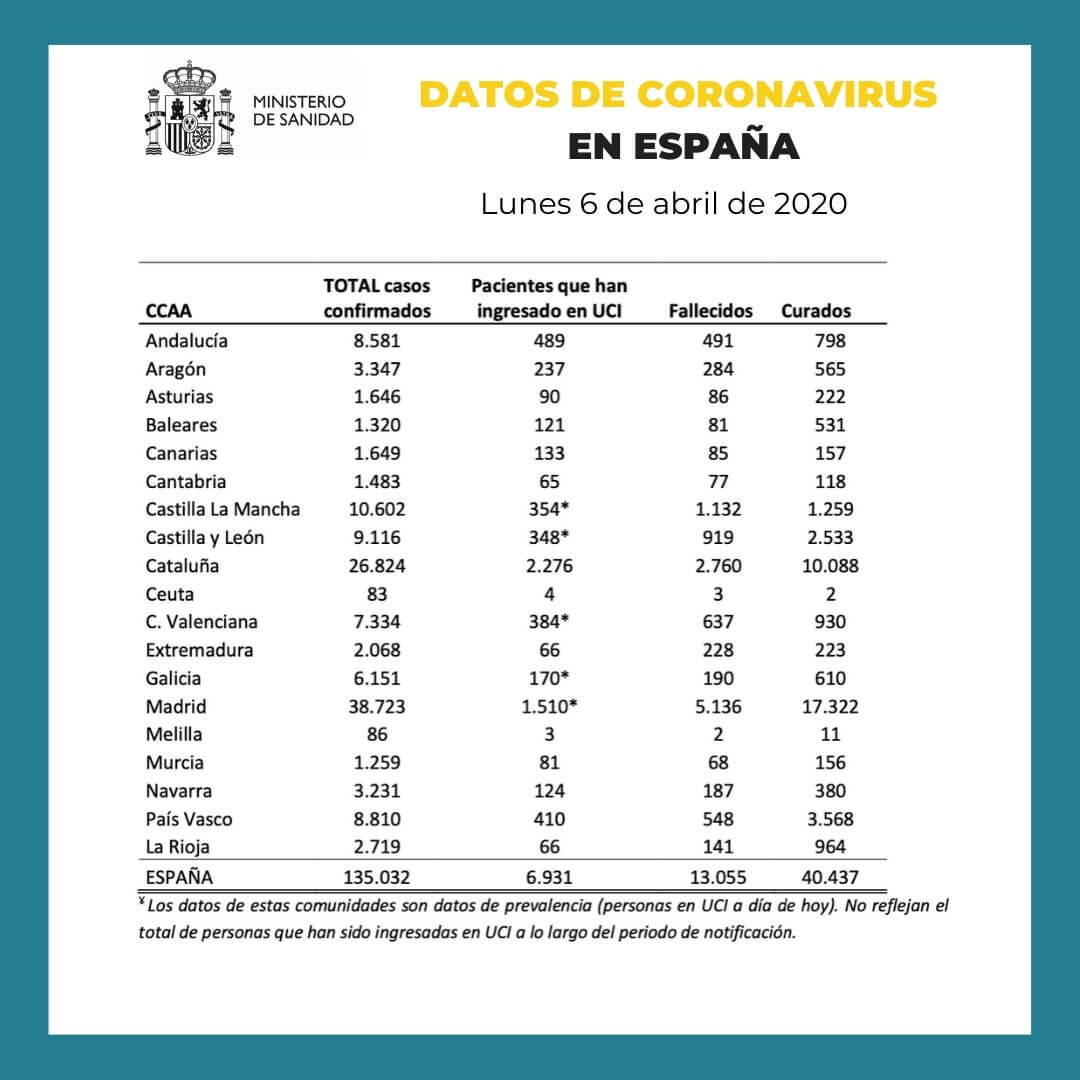 España registra este lunes, 6 de abril, 135.032 casos confirmados de coronavirus, tras aumentar en 4.273 en las últimas 24 horas, aunque se confirma la tendencia a la baja. Los muertos son ya 13.055, con 637 fallecidos más que ayer, un aumento menor que la semana pasada, según los últimos datos ofrecidos por el Ministerio de Sanidad. En el día de hoy hay 6.931 personas en Unidades de Cuidados Intensivos, 59.662 están hospitalizadas y 40.437 ya se han curado de la enfermedad.