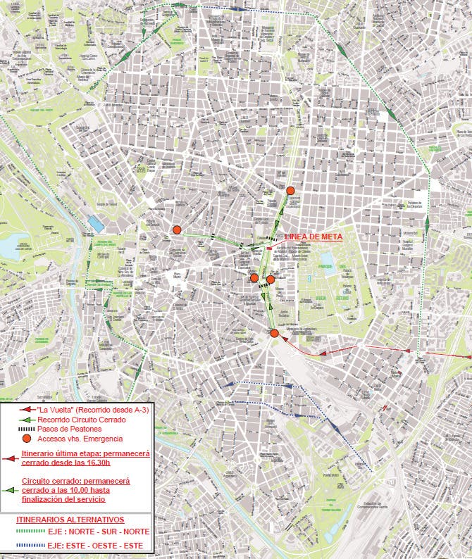La entrada de los ciclistas en Madrid tendrá lugar a partir de las 18.15 horas, tras salir desde Fuenlabrada y discurrir por la M-45 y la A-3. Desde las 16.30 h, y hasta que los ciclistas entren en el circuito cerrado (al que después darán 10 vueltas), se registrarán cortes de tráfico también en la Avenida del Mediterráneo, pasos inferiores de las plazas de Conde de Casal y de Mariano de Cavia, paseos Reina Cristina e Infanta Isabel y Glorieta del Emperador Carlos V.