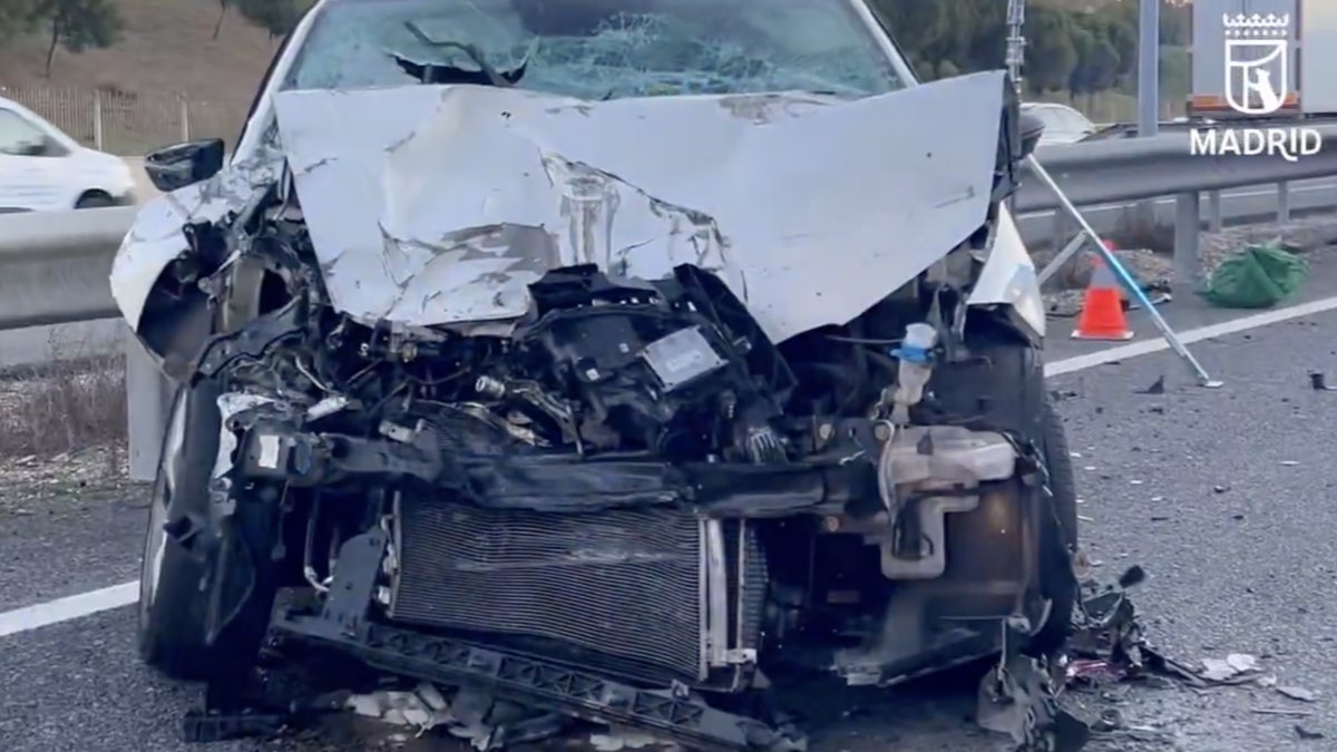 El coche ha quedado con graves daños tras una colisión por alcance, lo que ha obligado a la intervención de los Bomberos de la Comunidad de Madrid para rescatar a los cuatro jóvenes que viajaban en su interior.