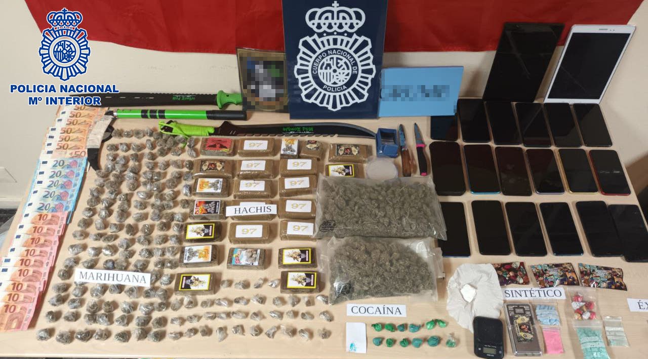 En el registro realizado en la vivienda se intervino abundante sustancia estupefaciente, concretamente 2.300 gramos de hachís, 440 gramos de marihuana, 25 gramos de cocaína y 190 pastillas de drogas sintéticas, entre otras. Además, se aprehendieron 46 teléfonos móviles, cuatro tablets, cuatro patinetes eléctri- cos, diversas armas blancas, útiles para la preparación de la droga, cuadernos manuscritos y 600 euros en efectivo.