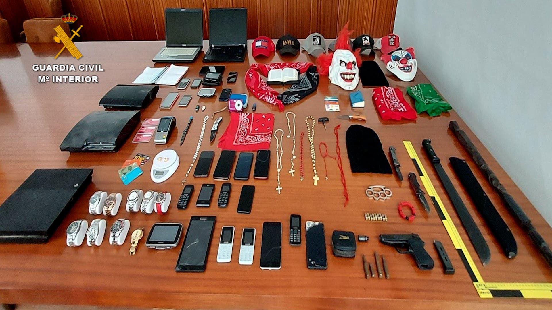 Junto con la detención de los integrantes de la organización, se han llevado a cabo varios registros en diversas localidades de Madrid, Barcelona, Álava y Guipúzcoa, en los que se ha intervenido documentación, armas simuladas, armas blancas, una importante cantidad de sustancias estupefacientes y numerosos dispositivos electrónicos de almacenamiento de información que serán analizados por especialistas en este ámbito.
