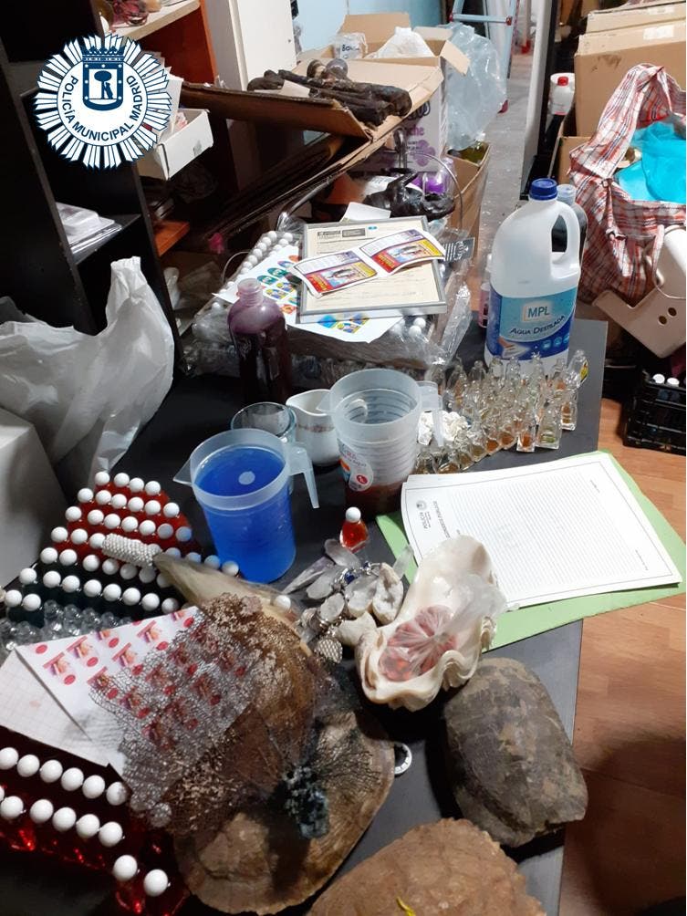 La Policía Municipal de Madrid ha localizado y requisado cuatro tibias humanas y restos de animales exóticos que supuestamente utilizaba personal de una santería del distrito de Usera para elaborar y vender pócimas y ungüentos.