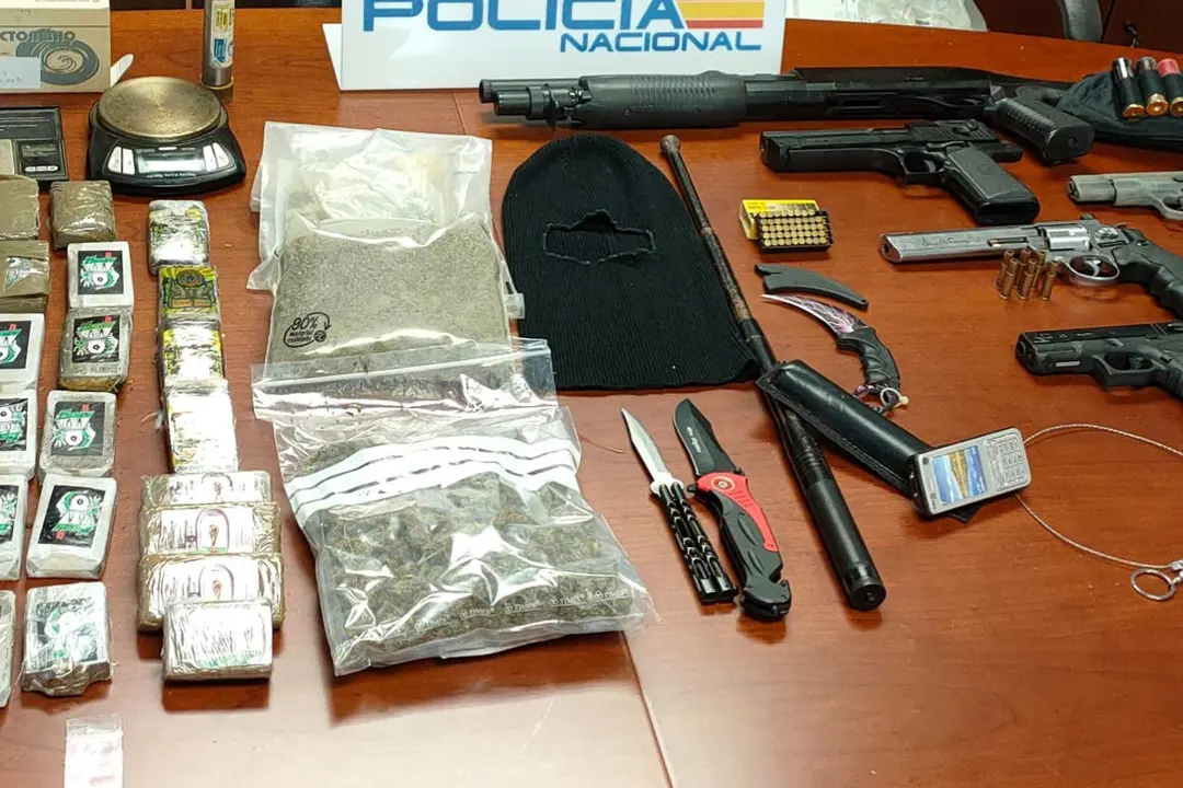 Durante el registro se procedió a la intervención de tres kilogramos de hachís, 500 gramos de marihuana, así como diferentes tipos de armas, las cuales se encontraban perfectamente ordenadas en el armario de la habitación: diversas pistolas y revólveres, un cable estrangulador, navajas variadas, machetes, una defensa extensible, una táser que simulaba tratarse de un teléfono móvil y 1.800 euros en efectivo.
