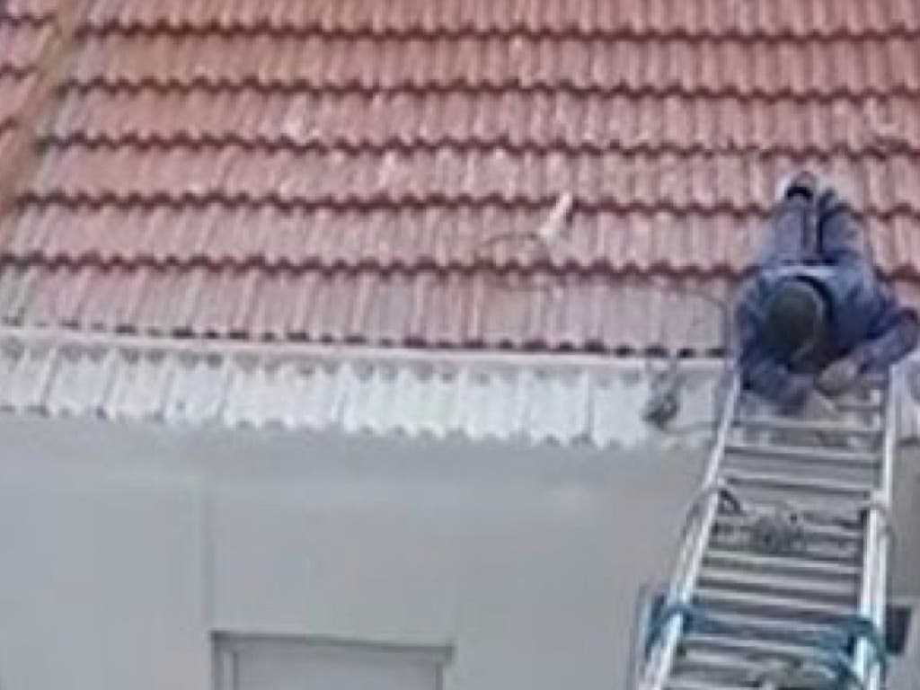 En las imágenes que consiguieron puede verse cómo dos personas eran obligados a subirse a dos escaleras atadas con cuerdas entre sí interpuestas entre dos tejados para pintar en las fachadas.