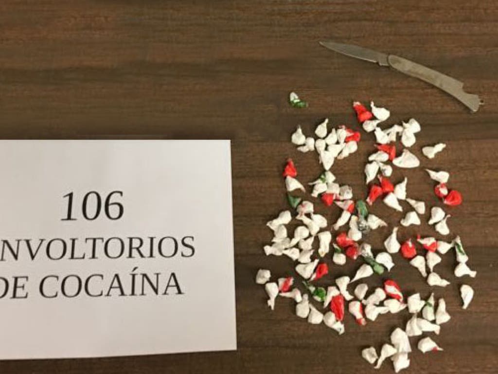 En el cacheo de seguridad, los agentes incautaron una navaja y localizaron en su zona genital un envoltorio de plástico con 106 bolsitas termo-selladas conteniendo una sustancia blanca.