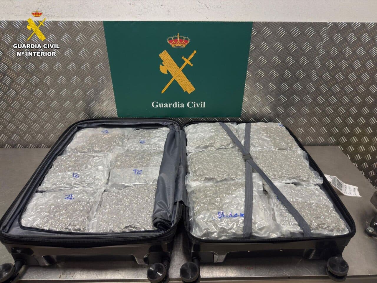 Agentes de la Guardia Civil de la Comandancia de Madrid, destinados en el Aeropuerto Adolfo Suárez Madrid-Barajas, han detenido a tres viajeros que llevaban en sus maletas 104 paquetes con casi 60 kilos de marihuana, según ha informado el Instituto Armado.