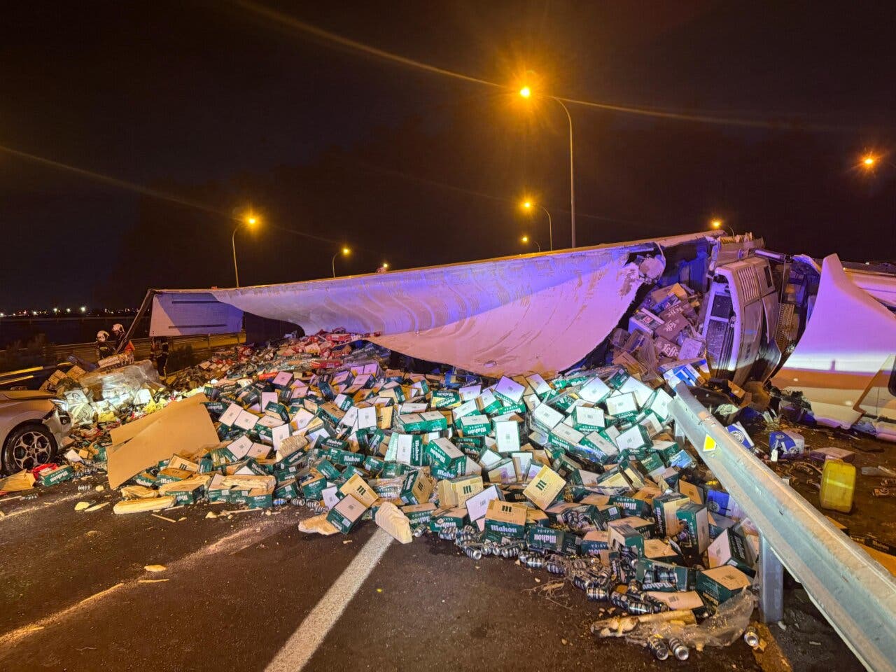 Dos heridos al volcar un tráiler con 20.000 botellines de cerveza en la M-50 en Getafe