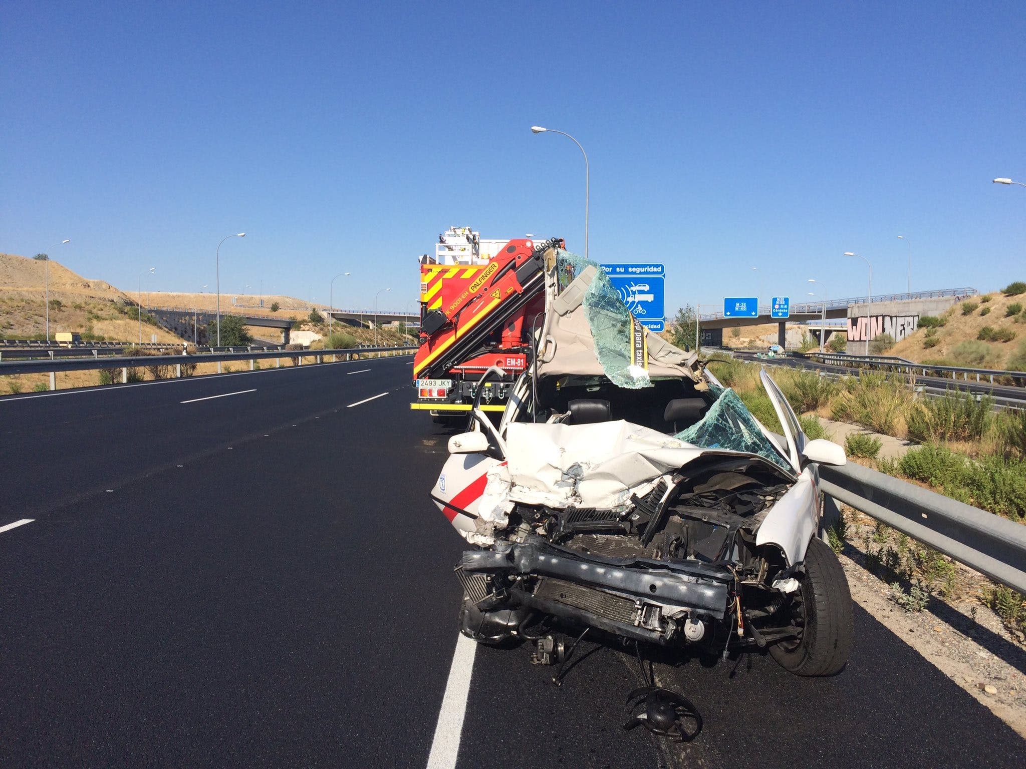 Los Bomberos del Ayuntamiento de Madrid se han trasladado al lugar para retirar los restos del taxi, ya que se ha convertido en un amasijo de hierros en la mitad de la calzada.