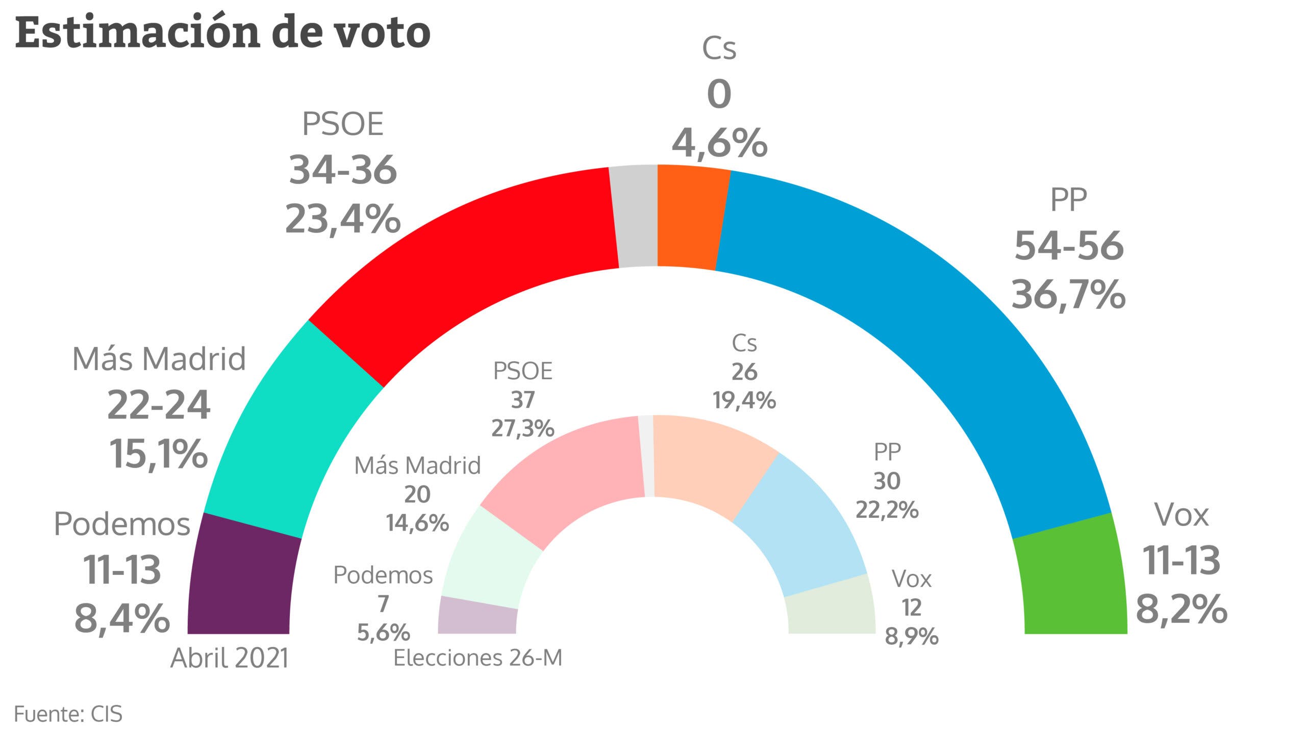 La encuesta del CIS, elaborada los pasados 19 y 20 de abril con 4.124 entrevistas telefónicas, da al PP de Ayuso una horquilla de entre 54 y 56 escaños y el 36,7 por ciento de los votos frente a los 59 escaños del sondeo de marzo que le otorgaba el 39,2 por ciento de los votos, pero concede una subida a Vox que llegaría hasta los 13, con un 8,2 por ciento de los votos.