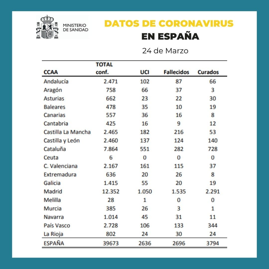 El coronavirus deja este martes en España 2.696 personas fallecidas (500 más que ayer) y un total de 39.673 casos positivos confirmados, lo que supone 6.000 más que ayer, según los últimos datos ofrecidos por el Ministerio de Sanidad.