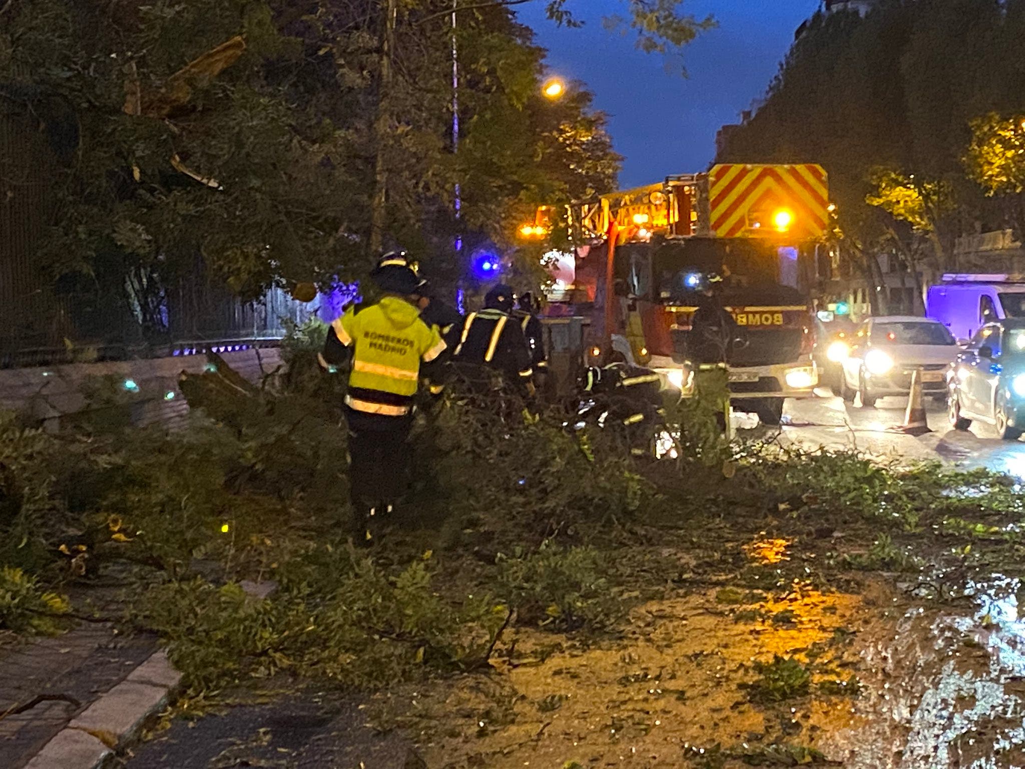 Los Bomberos de la Comunidad de Madrid han llevado a cabo alrededor de 200 intervenciones durante la noche, como esta en Arganda del Rey donde han tenido que sanear un árbol.