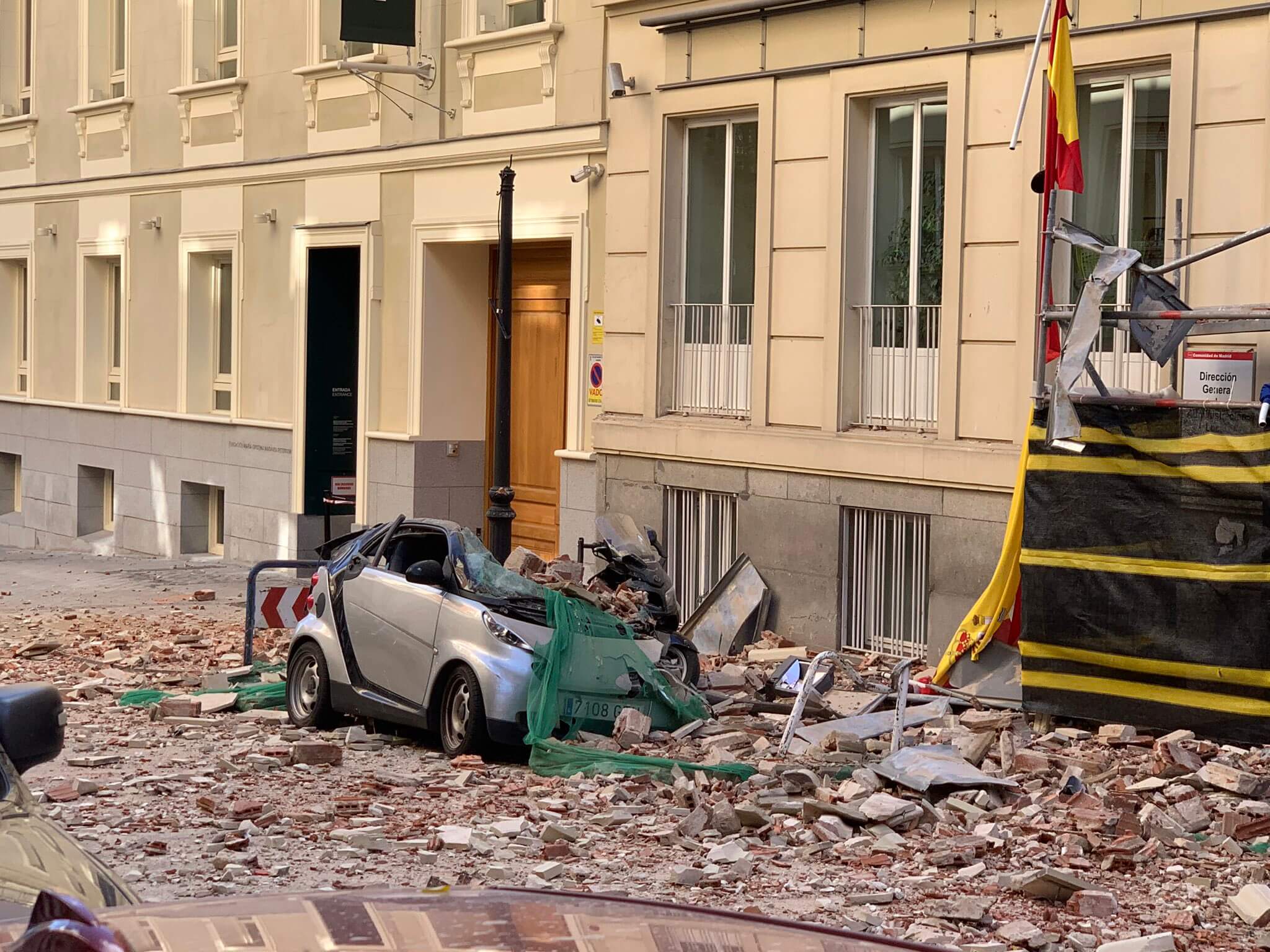 El derrumbe de una cornisa destroza varios vehículos en Madrid