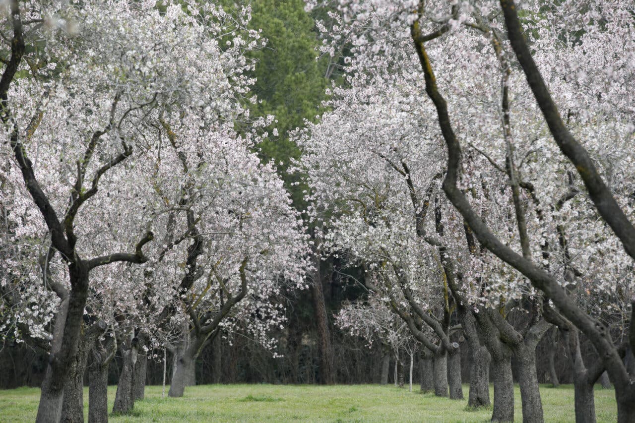 Esta combinación de distintas especies no solo contribuye a la diversidad paisajística, sino que también juega un papel fundamental en el proceso de polinización. La presencia de diferentes tipos de almendros favorece este proceso natural, incrementando la fertilidad y asegurando una floración más prolongada en el tiempo. Gracias a esta variedad, la Quinta de los Molinos ofrece, durante varias semanas, un espectáculo floral de extraordinaria belleza, en el que las tonalidades blancas y rosadas de los almendros en flor cubren el parque, atrayendo a visitantes y amantes de la naturaleza.