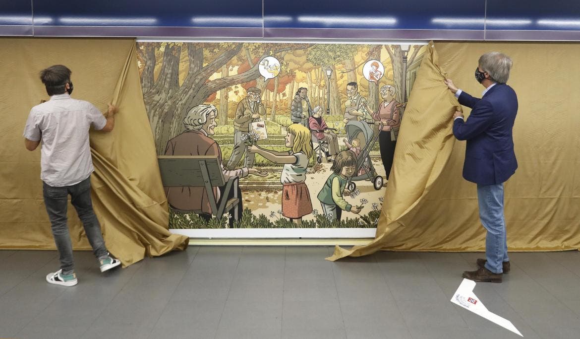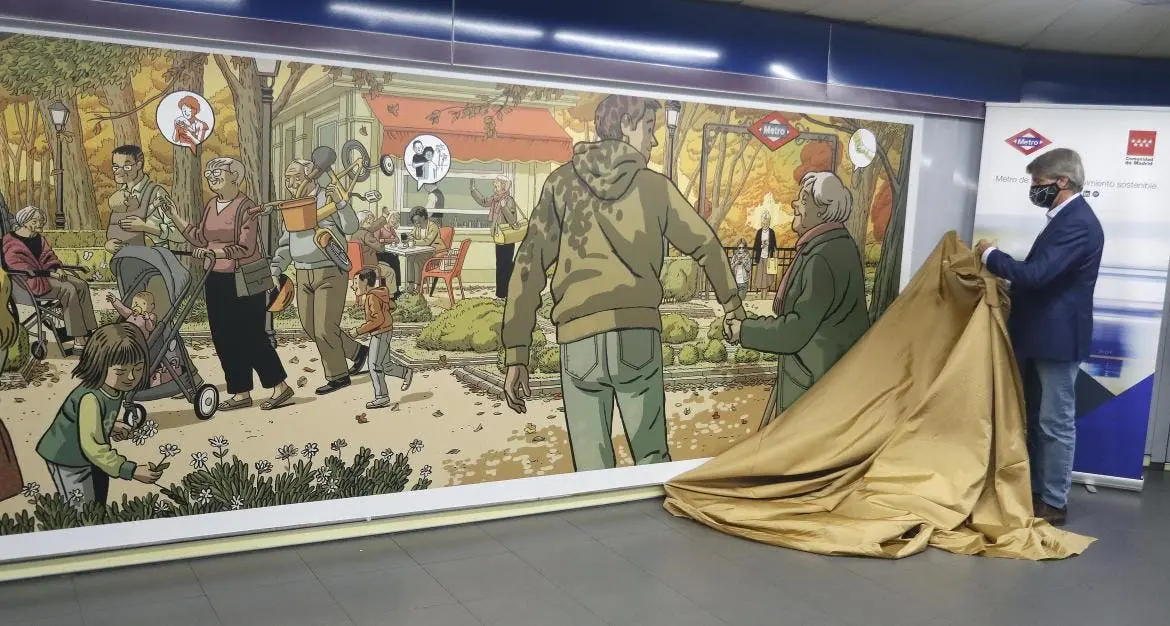 La Comunidad de Madrid rinde homenaje a los mayores, uno de los colectivos más afectados por el Covid-19, con un mural del ilustrador valenciano Paco Roca instalado en uno de los pasillos de la estación de Metro de Plaza de Castilla, una de las más transitadas de la red. El consejero de Transportes, Movilidad e Infraestructuras, Ángel Garrido, inauguró esta semana la obra junto al artista, con motivo del Día de los Abuelos, que se celebra este domingo.