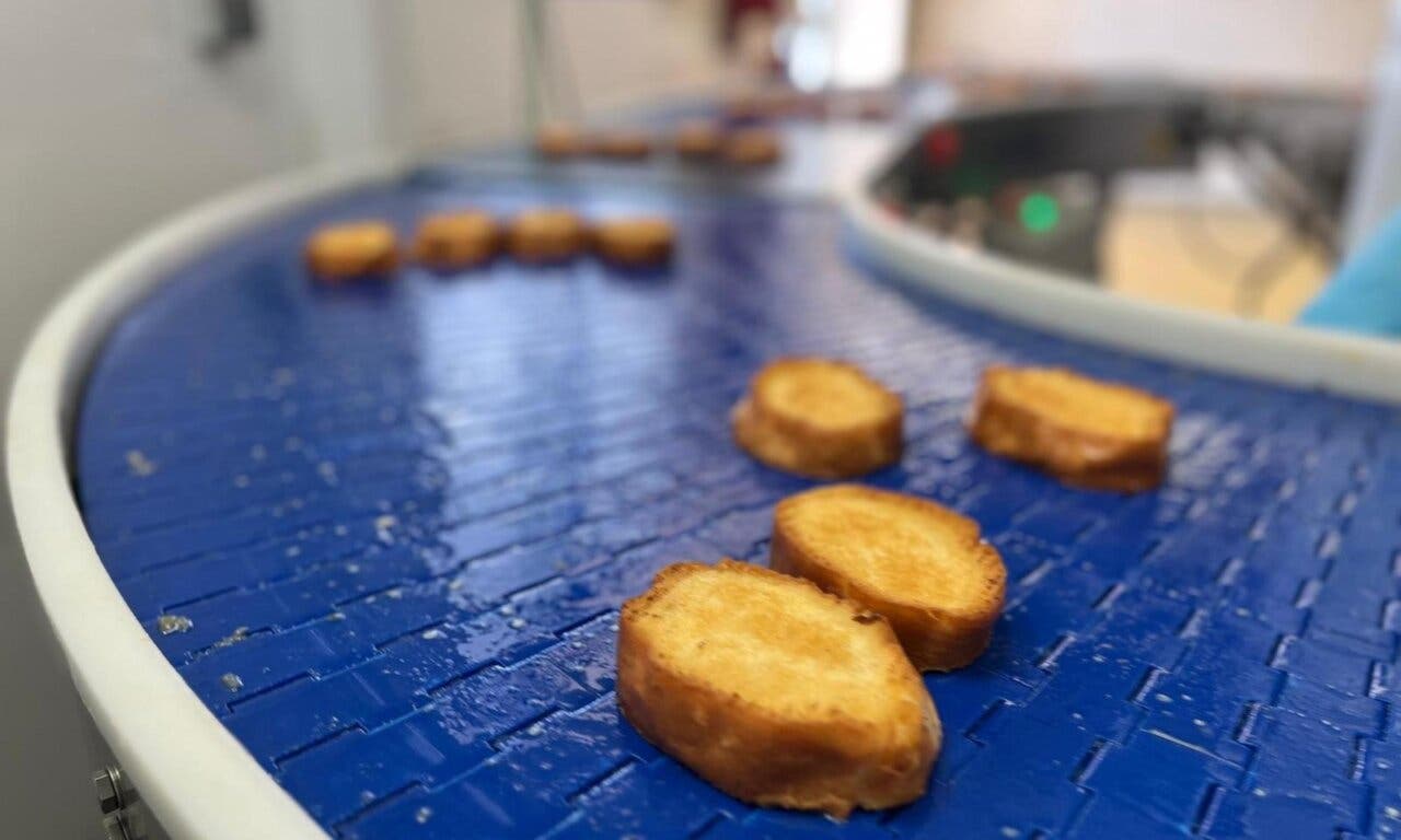 3. Después, cada rebanada se gira manualmente, una a una, para asegurar que la impregnación sea uniforme por ambos lados, tal como se haría en casa.