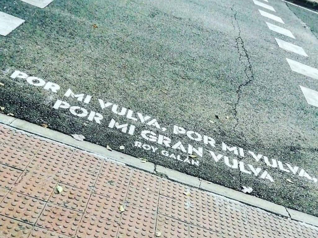 En el paso de cebra situado a la altura del número 43 de la Avenida de Moratalaz y la Plaza Corregidor Alonso de Aguilar se puede leer: «Por mi vulva, por mi vulva, por mi gran vulva», de Roy Galán.