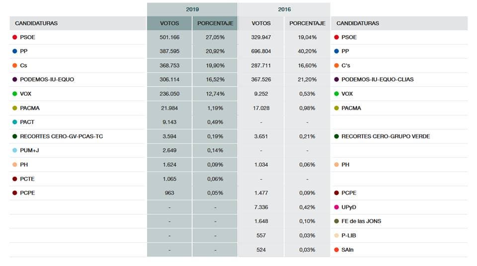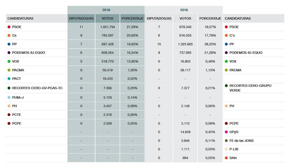 El PSOE lograba el 27,05%. Podemos caía desde la segunda a la cuarta posición con un 16,52%, mientras que VOX se hacía con un 12,74%.