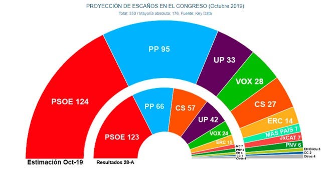Con estos resultados, ningún bloque logra sumar los 176 diputados que conforman la mayoría absoluta, por lo que podría mantenerse la situación de colapso político que impidió a Pedro Sánchez ser investido presidente y llevó a repetir las elecciones, sobre todo después de que tanto PP como PSOE hayan rechazado una hipotética gran coalición PP-PSOE.