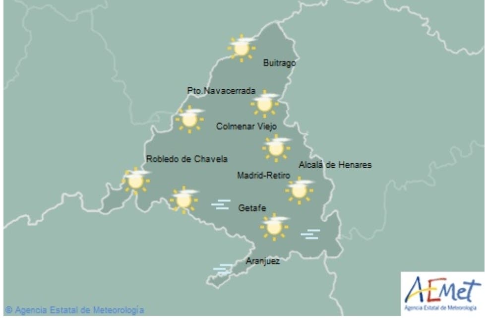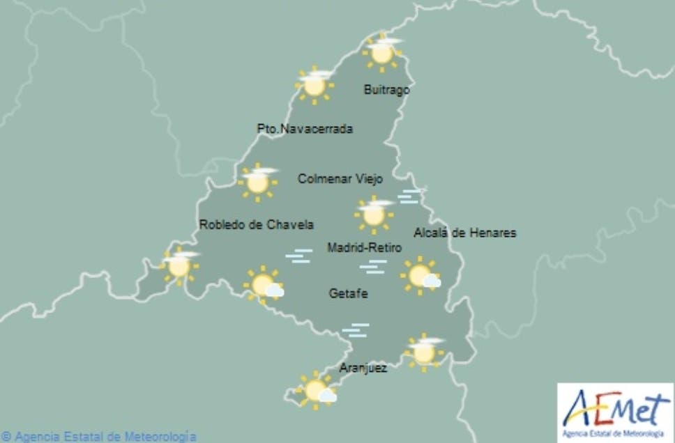 Los termómetros marcarán 14 de máxima y 5 de mínima en Madrid capital, 15-0 en Alcalá de Henares, 14-4 en Getafe, 15-9 en Collado Villalba, 14-0 en Navalcarnero, y 16-2 en Aranjuez.