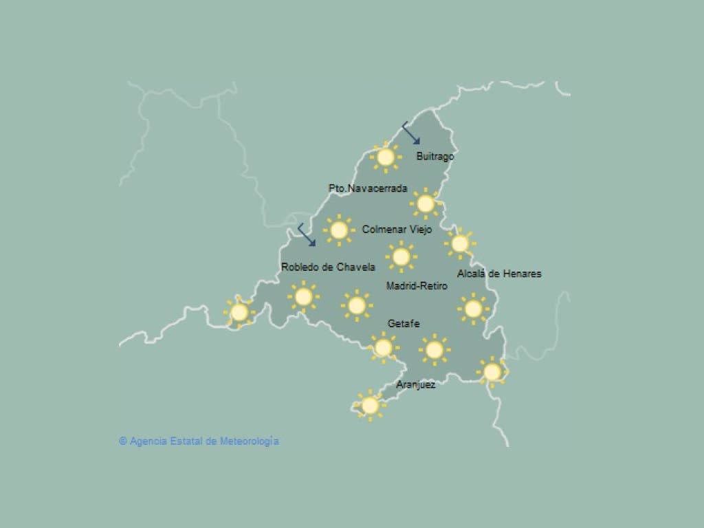 Las temperaturas previstas en algunas localidades de la región son 14 de máxima y -2 de mínima en Alcalá de Henares, 13-0 en Aranjuez, 18-3 en Collado Villalba, 13-1 en Getafe, 13-0 en Madrid, y 14-3 en Navalcarnero. El tiempo se mantendrá estable también durante la jornada del jueves.