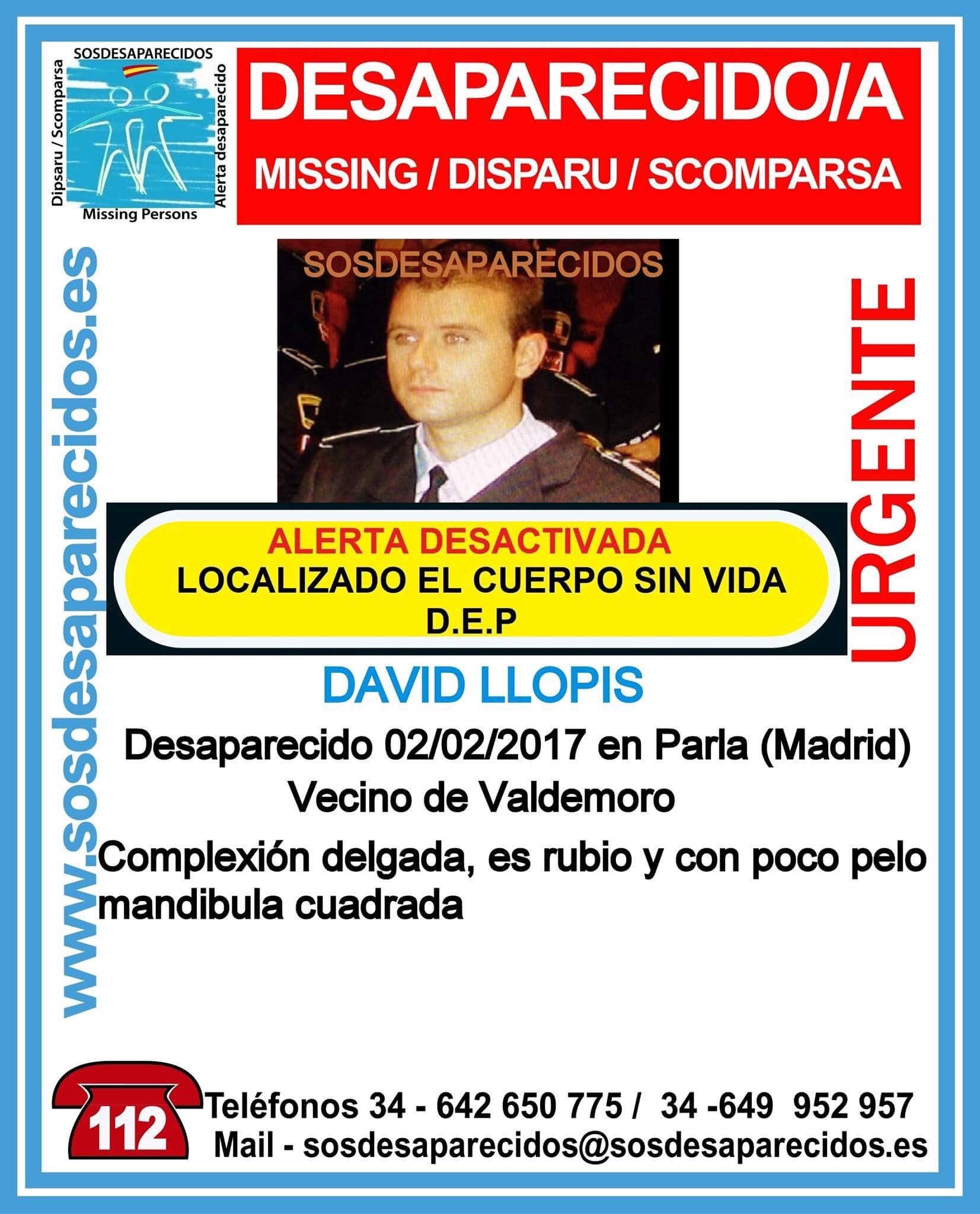 La Guardia Civil de Toledo ha confirmado que el cadáver hallado este domingo en la localidad de Burujón, en la provincia de Toledo, corresponde a David Llopis, el agente de la Policía Local de Parla desaparecido desde el pasado lunes, cuando no se incorporó a su puesto de trabajo en la Unidad de Atestados del cuerpo municipal.