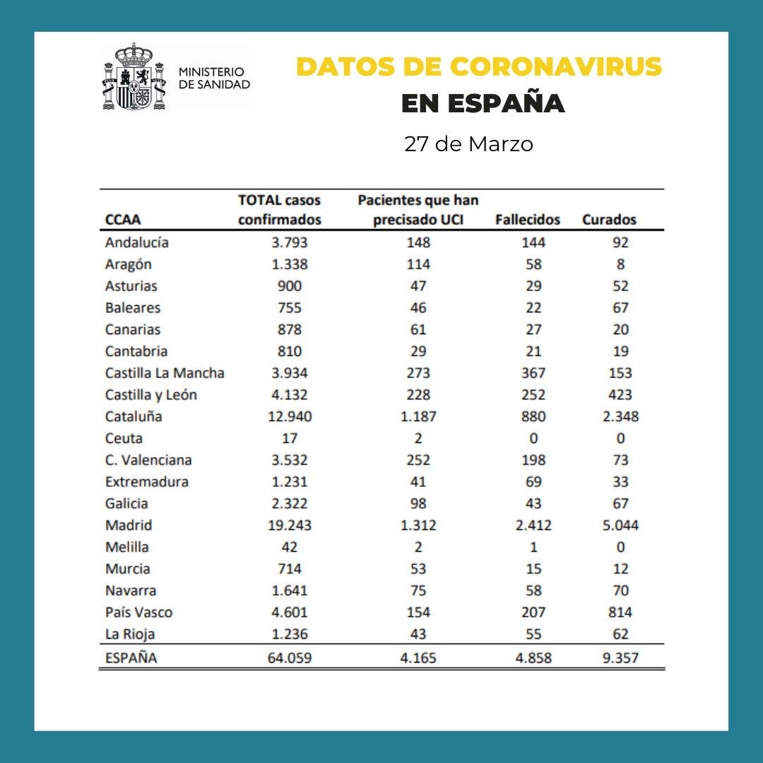 El número de positivos se eleva hasta los 64.059, 7.871 más que ayer; mientras que los pacientes curados son ya 9.357, 2.342 más respecto al jueves. En la UCI continúan 4.165 personas.