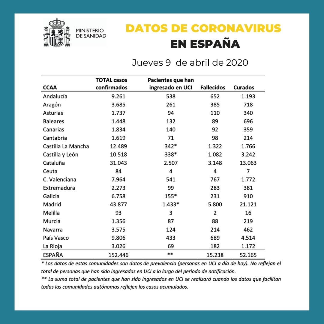 España ha superado este jueves, 9 de abril, los 15.200 fallecidos, con un total de 15.238 muertos por la pandemia del coronavirus, según los últimos datos ofrecidos por el Ministerio de Sanidad. Nuestro país suma otros 683 fallecidos en las últimas 24 horas, una cifra menor que la de los dos últimos dos días pero igual de aterradora.