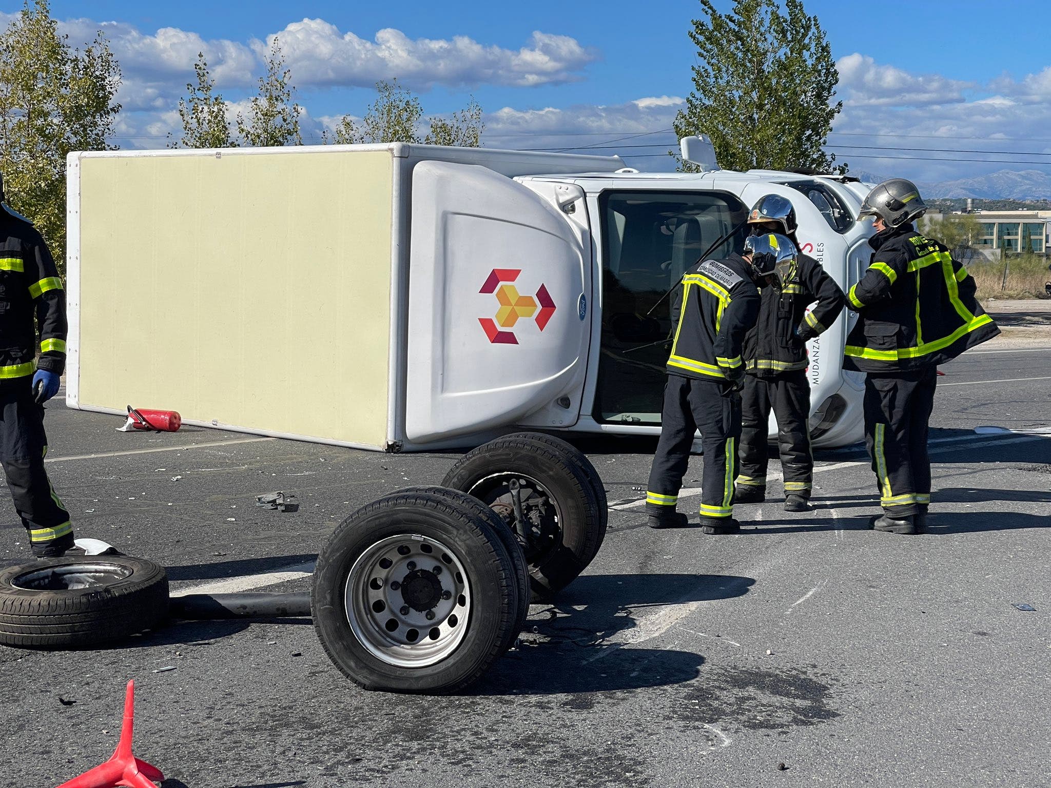 Espectacular accidente entre un turismo y un camión de mudanzas en la M-509, en Villanueva del Pardillo