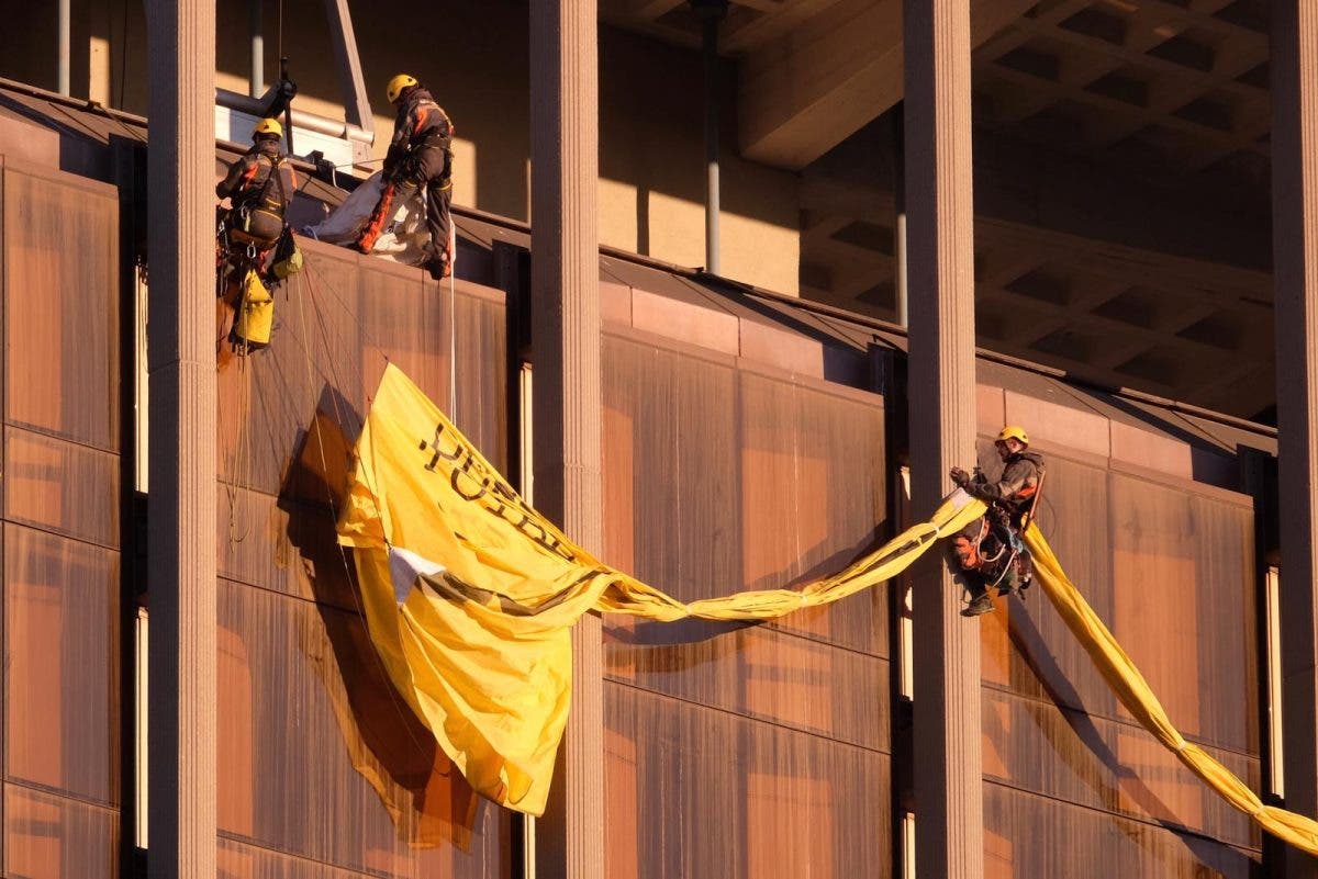 Greenpeace despliega una enorme pancarta en las torres de Colón