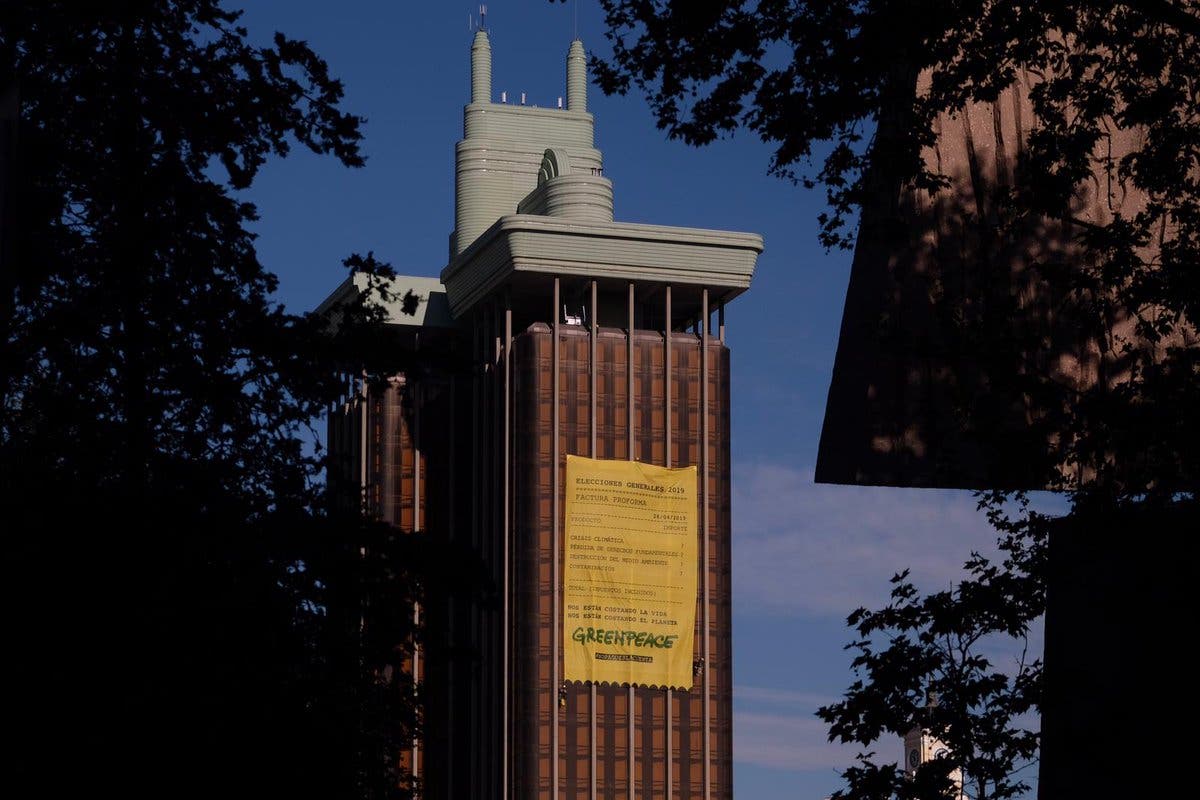 Greenpeace despliega una enorme pancarta en las torres de Colón