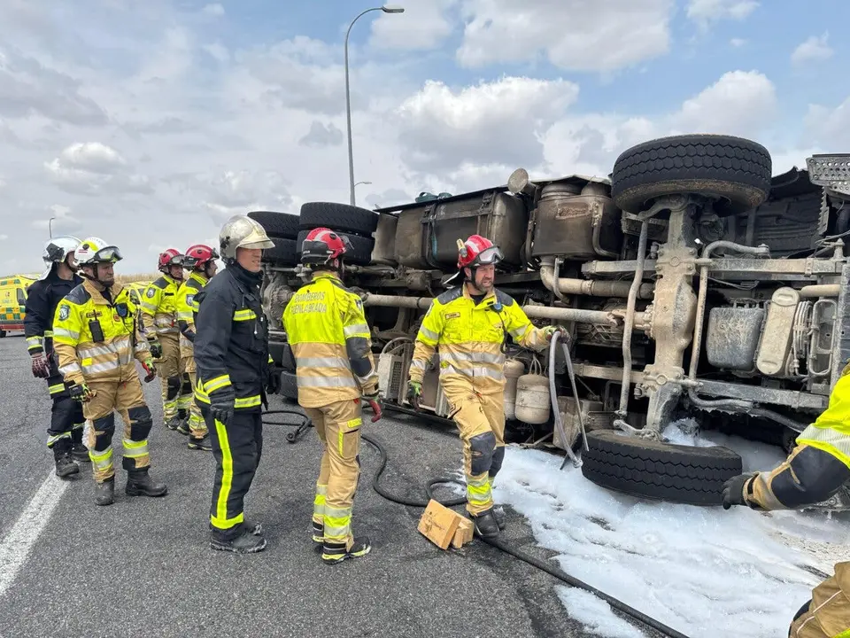 El vehículo, un camión de carga con pluma, ha volcado parcialmente, lo que ha provocado que el conductor quedara atrapado en el interior. Hasta el lugar se han desplazado los Bomberos de la Comunidad de Madrid, el SUMMA y agentes de la Guardia Civil.