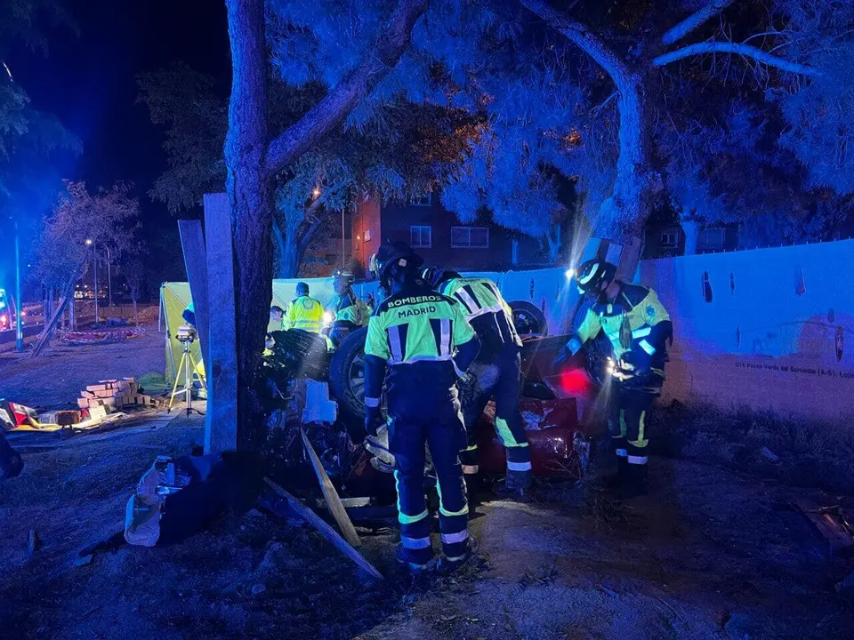 Los Bomberos del Ayuntamiento de Madrid han rescatado al hombre, que había quedado atrapado en el interior. El coche ha terminado fuera de la calzada, volcado entre dos árboles.