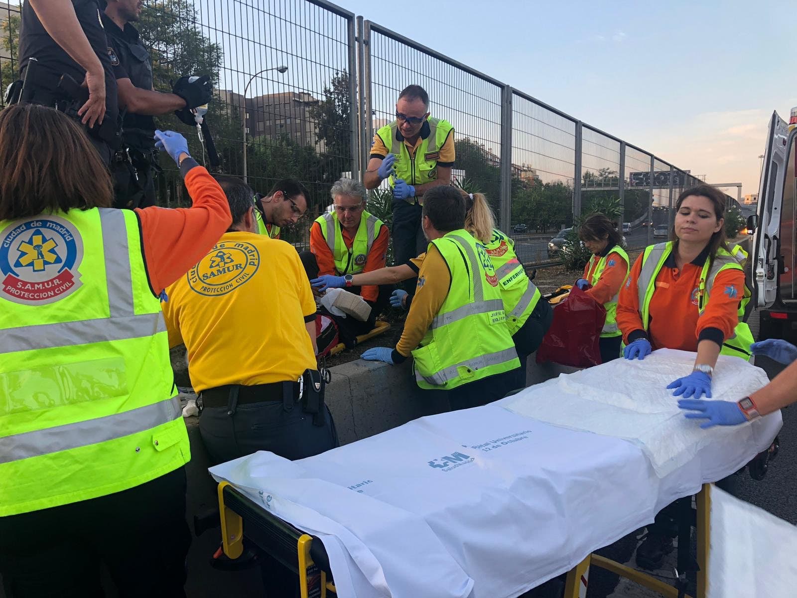 Tras ser golpeado por un vehículo, sufrió fractura abierta de tibia y peroné, fractura de brazo y diversas contusiones, por lo que fue trasladado por el SAMUR al Hospital 12 de Octubre donde ingresó en estado grave, ha indicado Emergencias Madrid.