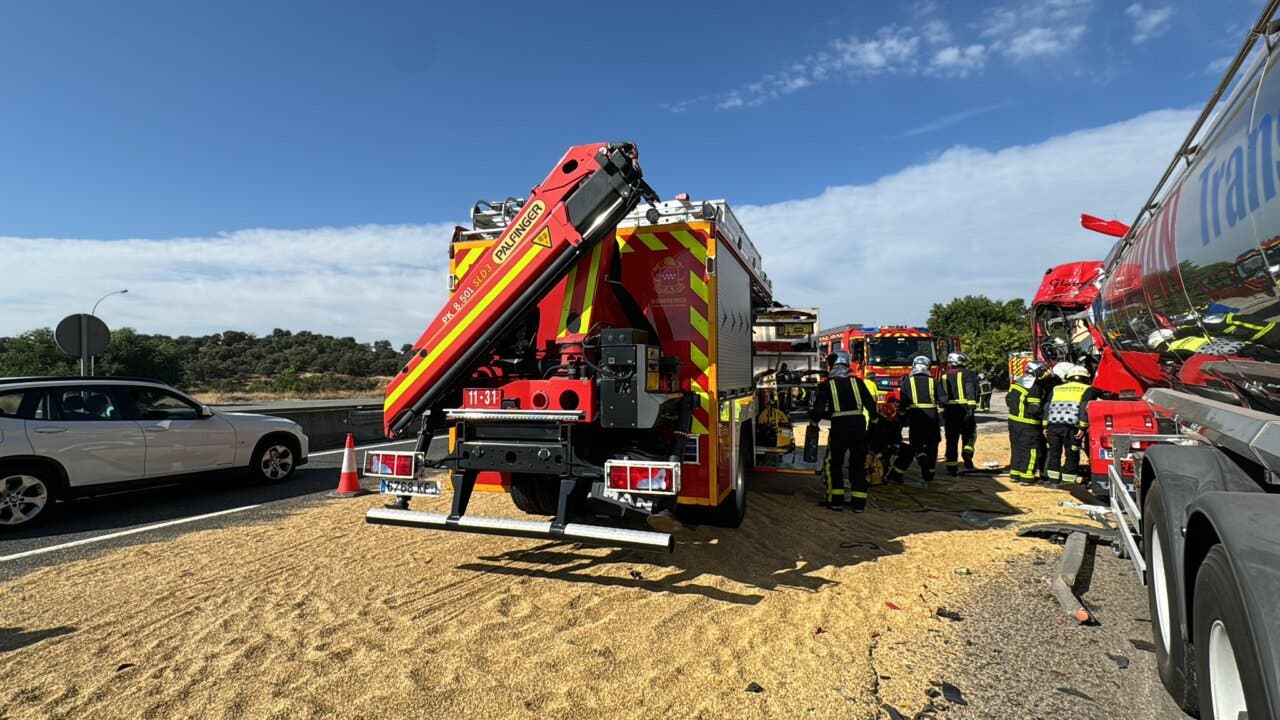 El accidente ha ocurrido sobre las 9:50 horas en el kilómetro 37 sentido entrada, donde un camión que transportaba aceite vegetal ha chocado contra otro que llevaba grano de cebada, quedando parte de la carga esparcida en el carril derecho de la autovía.