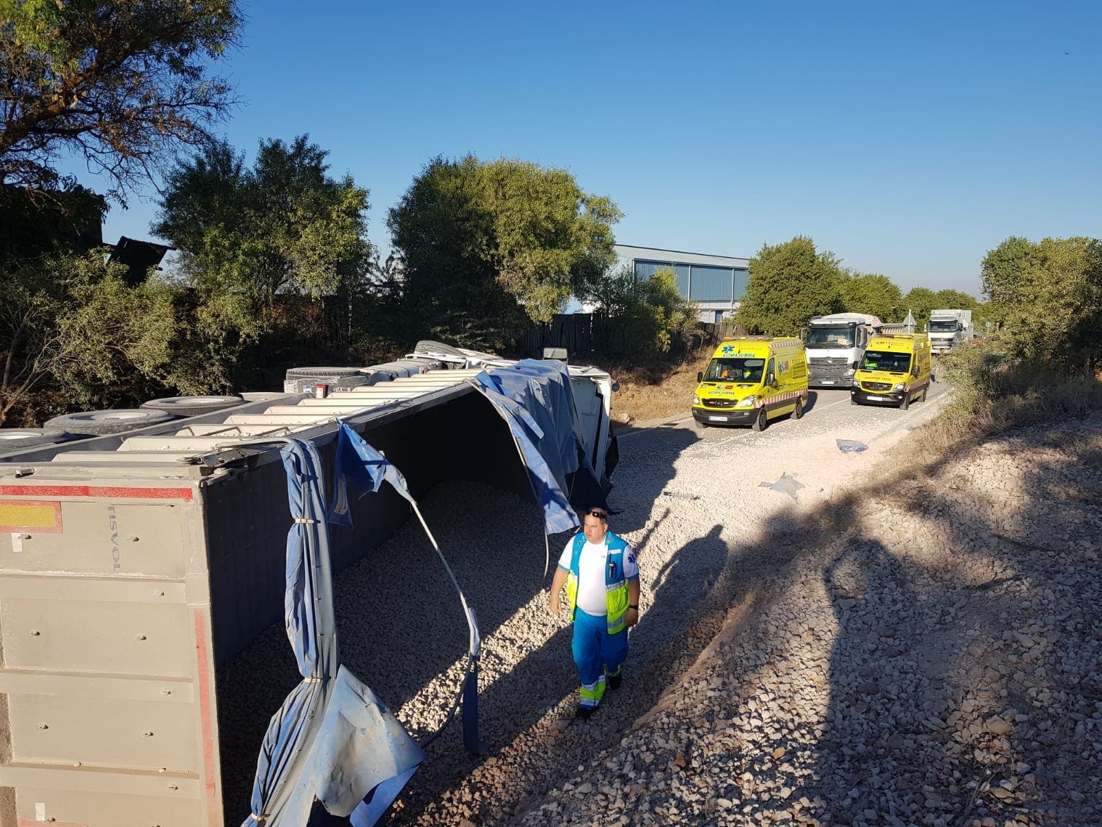 El accidente fue bastante aparatoso al quedar completamente volcado el camión en la carretera, por lo que tuvieron que intervenir los Bomberos de la Comunidad de Madrid.