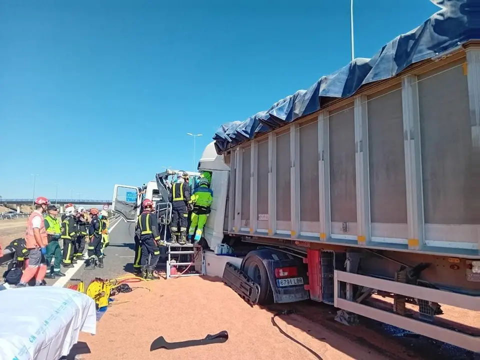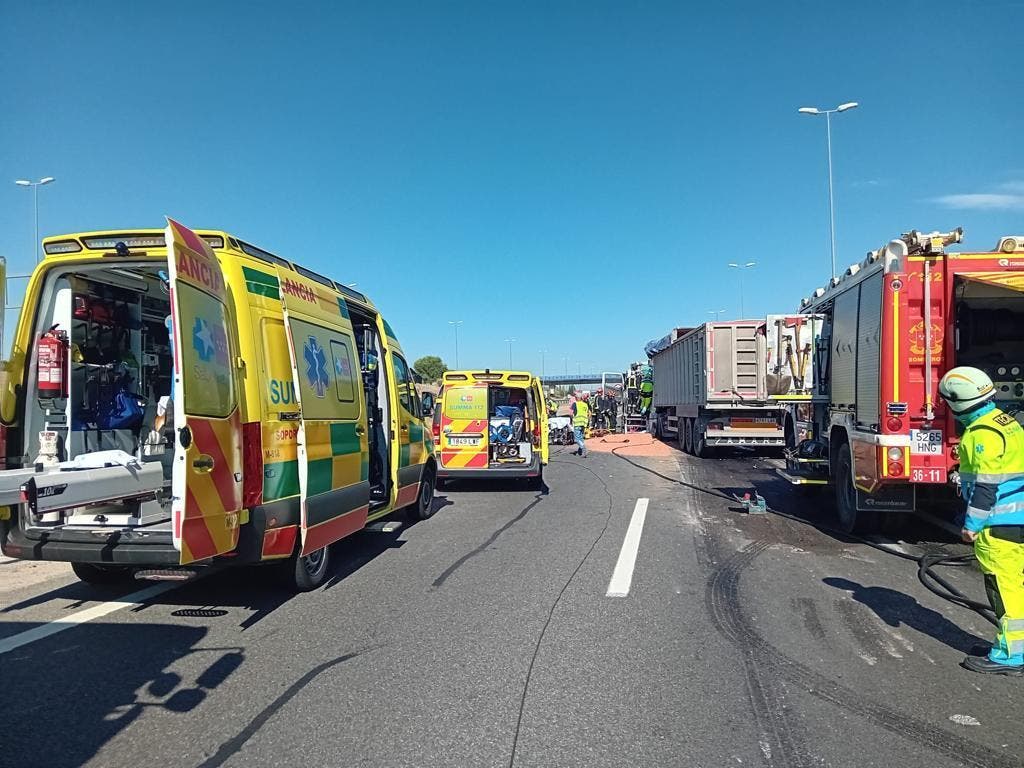 En ese punto se ha producido una colisión entre dos camiones y los Bomberos de la Comunidad de Madrid han tenido que rescatar al conductor de uno de ellos, que estaba atrapado.