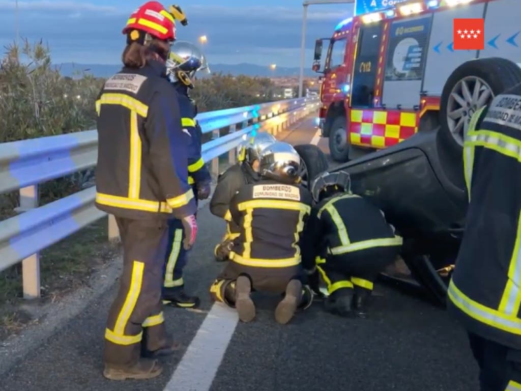 El siniestro, con dos vehículos implicados y uno de ellos volcado, se ha producido a la altura del kilómetro 69 de la M-50, en Boadilla.
