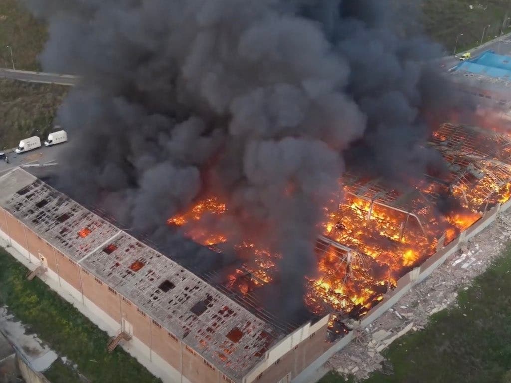 La Unidad de Drones de los Bomberos de la Comunidad de Madrid ha compartido unas impresionantes imágenes del incendio que se ha producido esta mañana en una nave industrial del polígono Cobo Calleja de la localidad de Fuenlabrada, donde han ardido toneladas de ropa fabricada en China.