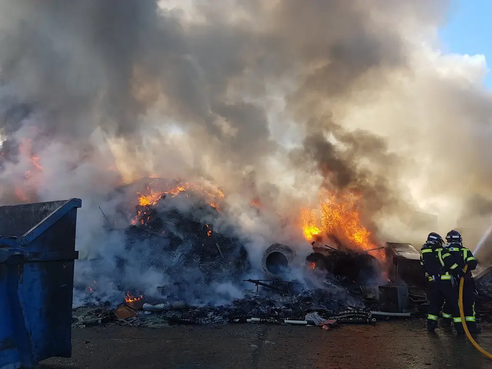 Incendio en una nave de chatarra a cielo abierto en Vicálvaro
