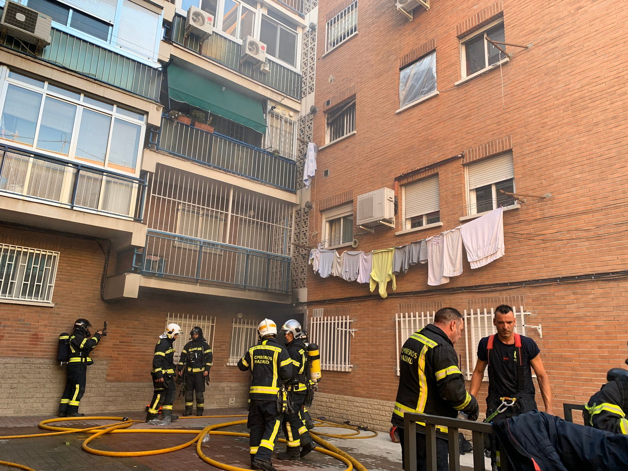 Los Bomberos del Ayuntamiento de Madrid controlaron y extinguieron las llamas, que provocaron una gran carga de humo que inundó la escalera del edificio.