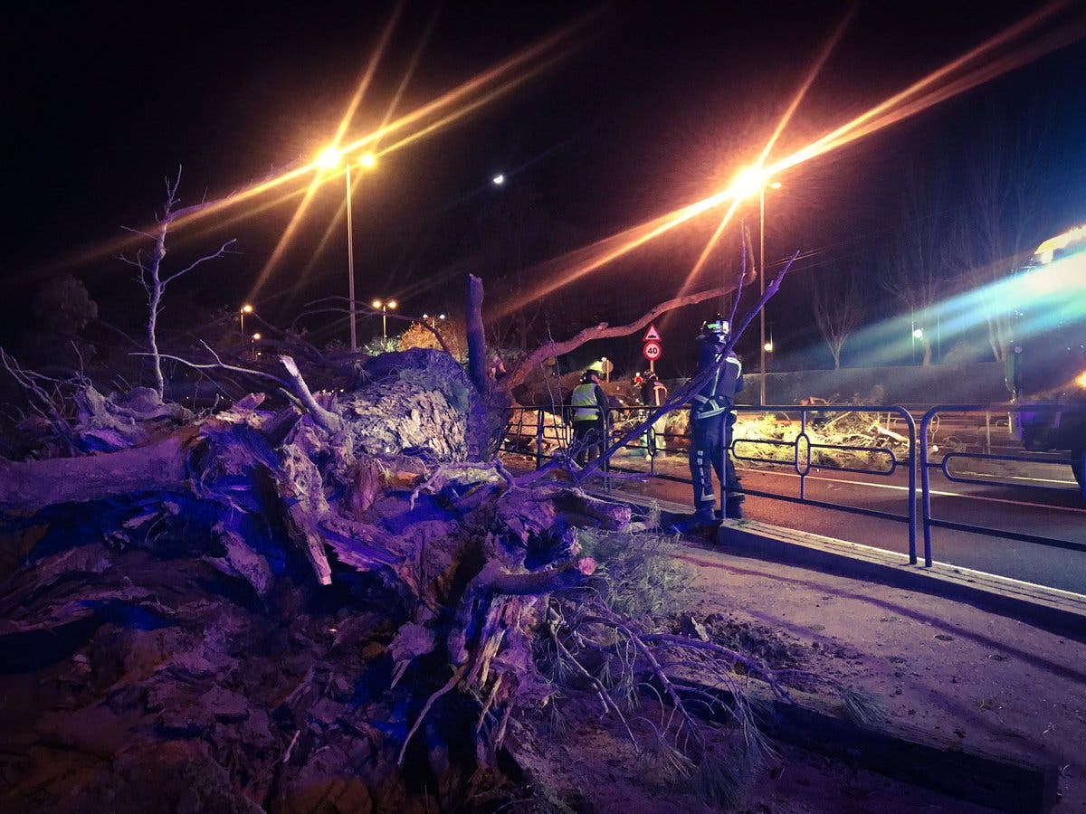 Los Bomberos de la Comunidad de Madrid han permanecido varias horas en el lugar del suceso tratando de retirar los restos del árbol caído y el vehículo, que ocupaban parte de la vía.