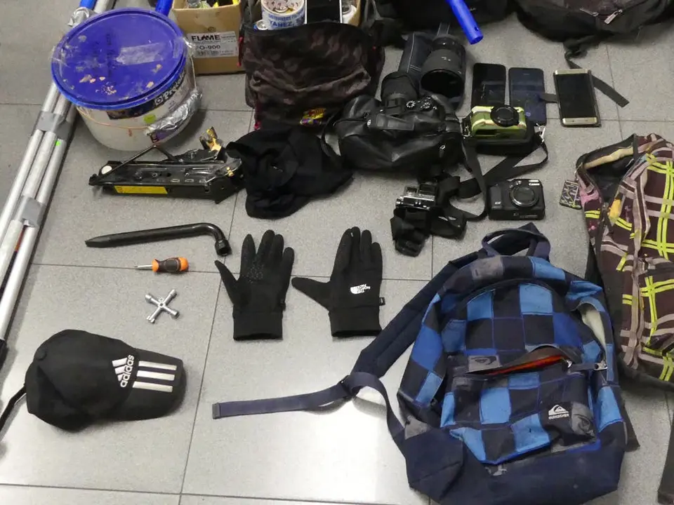 En el pertinente registro del coche, los policías encontraron 30 botes de spray de diversos colores, tres botes grandes de pintura, cuatro rodillos y cuatro palos de pintor. Además les fueron intervenidas cuatro cámaras fotográficas y de video que son utilizadas para plasmar y tener un recuerdo de la pintada.