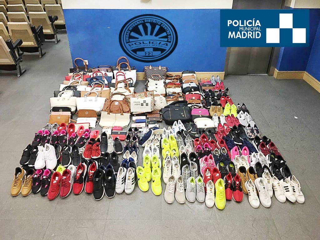 Sospecharon de un vehículo detenido frente a un portal en el que dos varones estaban cargando bolsas de grandes dimensiones. Al dirigirse al vehículo, los agentes comprobaron que la mercancía consistía en bolsos, zapatillas y monederos con logotipos distintivos de diferentes marcas de reconocido prestigio, cuyas características no coincidían con los originales.