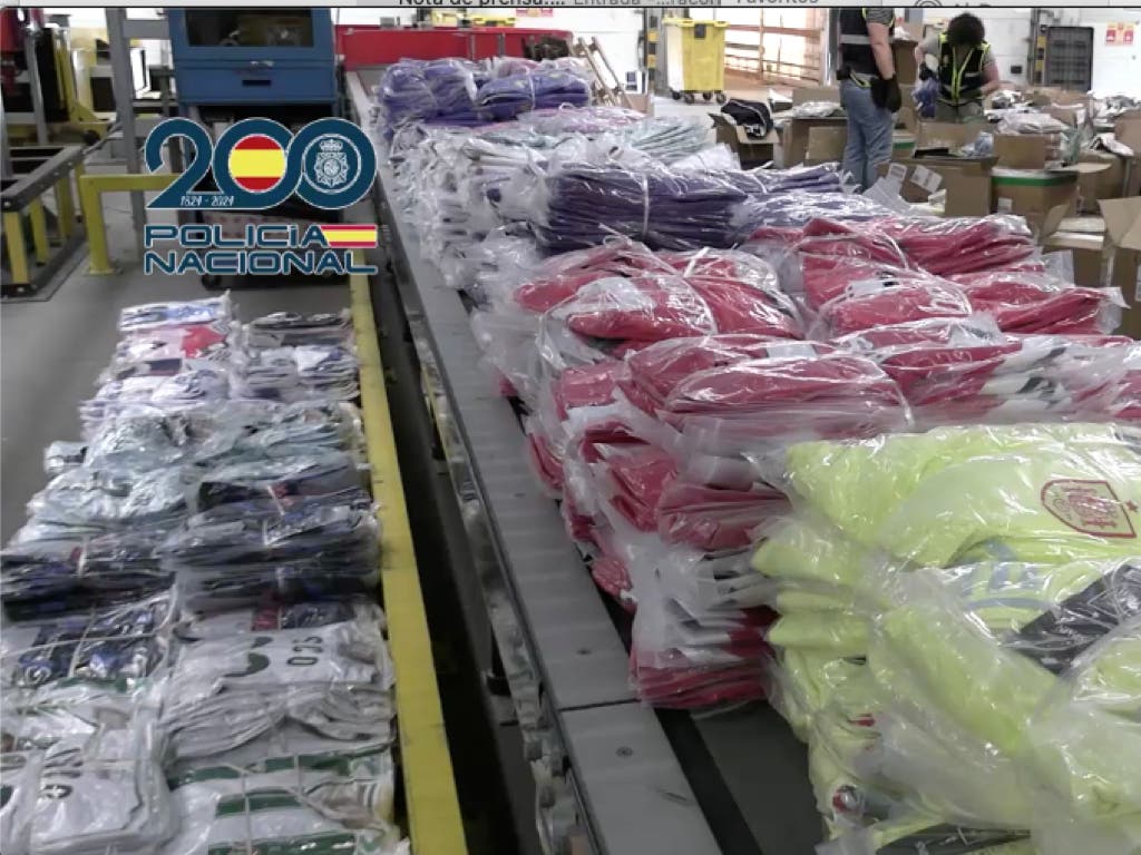 Agentes de la Policía Nacional han intervenido en Madrid más de 11 toneladas de camisetas falsificadas de equipos de fútbol. Estaban destinadas a abastecer a varias organizaciones que pretendían venderlas de manera ilícita durante la final de la Champions League y la EUROCUP 2024. Se trata de una operación que continúa abierta y han sido localizadas durante la inspección de 15 camiones de gran tonelaje que transportabas varios productos falsificados como relojes de lujo, productos de marroquinería y de electrónica.