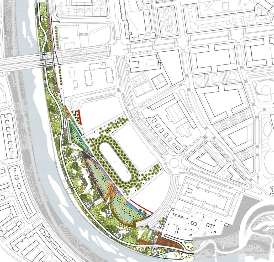 Por su parte, en la zona central, donde se ubicaba el estadio Vicente Calderón, se concibe una gran pradera alargada con remates circulares en forma de circo romano que evocará el carácter lúdico y de espectáculo del antiguo campo de fútbol. Alrededor se dispondrán la pista de atletismo anteriormente mencionada y árboles frondosos que aportarán una coloración cambiante a lo largo del año. El nuevo tramo de Madrid Río forma parte del ámbito Mahou-Calderón, que contará con más de 1.300 viviendas y nuevos equipamientos públicos para los vecinos de la zona.