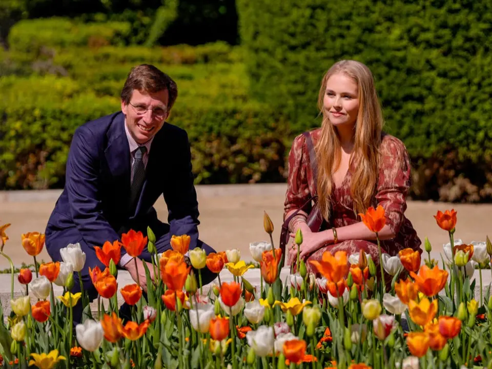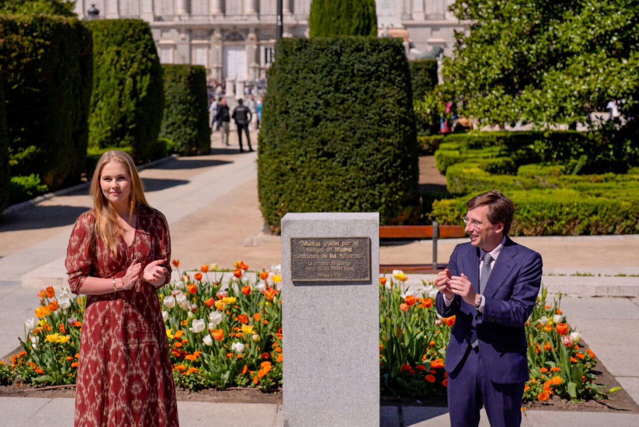 El alcalde de Madrid, José Luis Martínez-Almeida, junto a la princesa Amalia de Orange, ha descubierto hoy una placa de agradecimiento por parte de la heredera al trono de Países Bajos por su «tiempo en Madrid», en el jardín de tulipanes de la Plaza de Oriente.