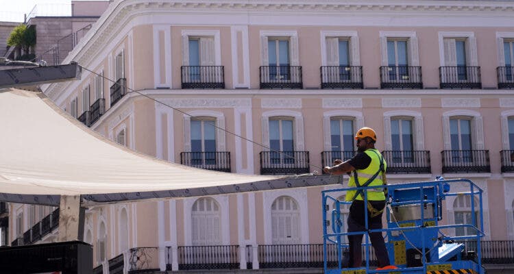 La Puerta del Sol contará este verano con zonas de sombra por primera vez en su historia. La solución elegida por el Ayuntamiento de Madrid es una estructura auxiliar no permanente que ya se encuentra en su fase final de instalación.