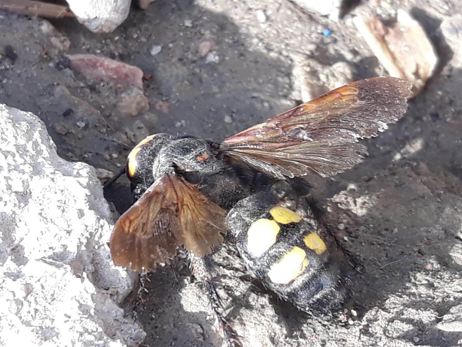 3. La avispa mamut (Megascolia maculata) es otro tipo que sí hay en Madrid. Cabeza rojiza y cuerpo negro con cuatro manchas en el abdomen. Son más solitarias que el resto de himenópteros, lo que las hace menos peligrosas.